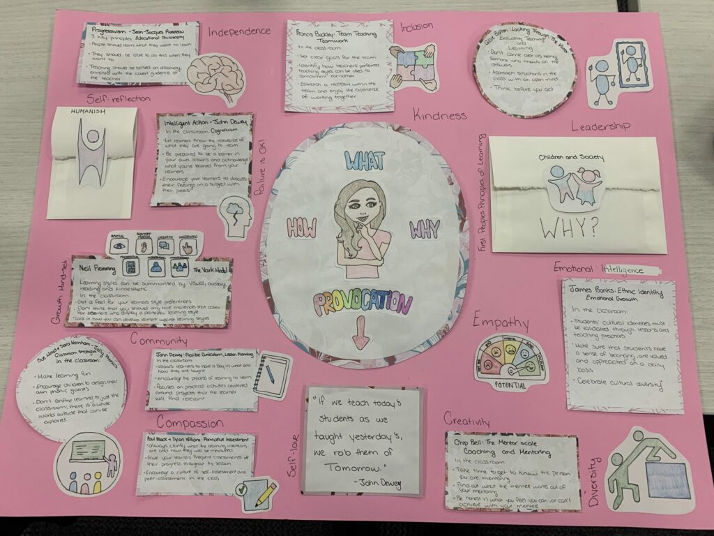 The project shown above represents the what, why, and how I would like to teach. Many of the words throughout the poster such as community, inclusivity, compassion, FPPL, and self- reflection are some of the values that I hold close to my heart and value in my educational philosophy.