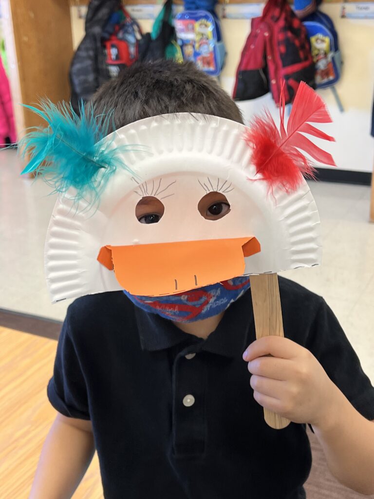 More G for Goose this week! We started the lesson by reading a book about a mother goose who has 4 babies but one of them ends up being a duck. Despite her little ducks differences she cares for the duck as one of her own geese. All of the geese siblings love their duck sibling and they love the addition to their family. We then made some goose masks and practiced our goose actions and sounds.