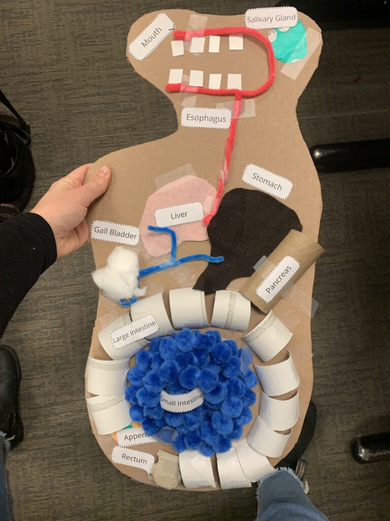 Recycled digestion system from Bonnies class. This was one of the projects presented by one of my classmates in our lessons. I thought this was a significant lesson to get hands-on learning, as well as, including learning about how to care for the earth. We has so much fun doing this while also learning about the digestive system.