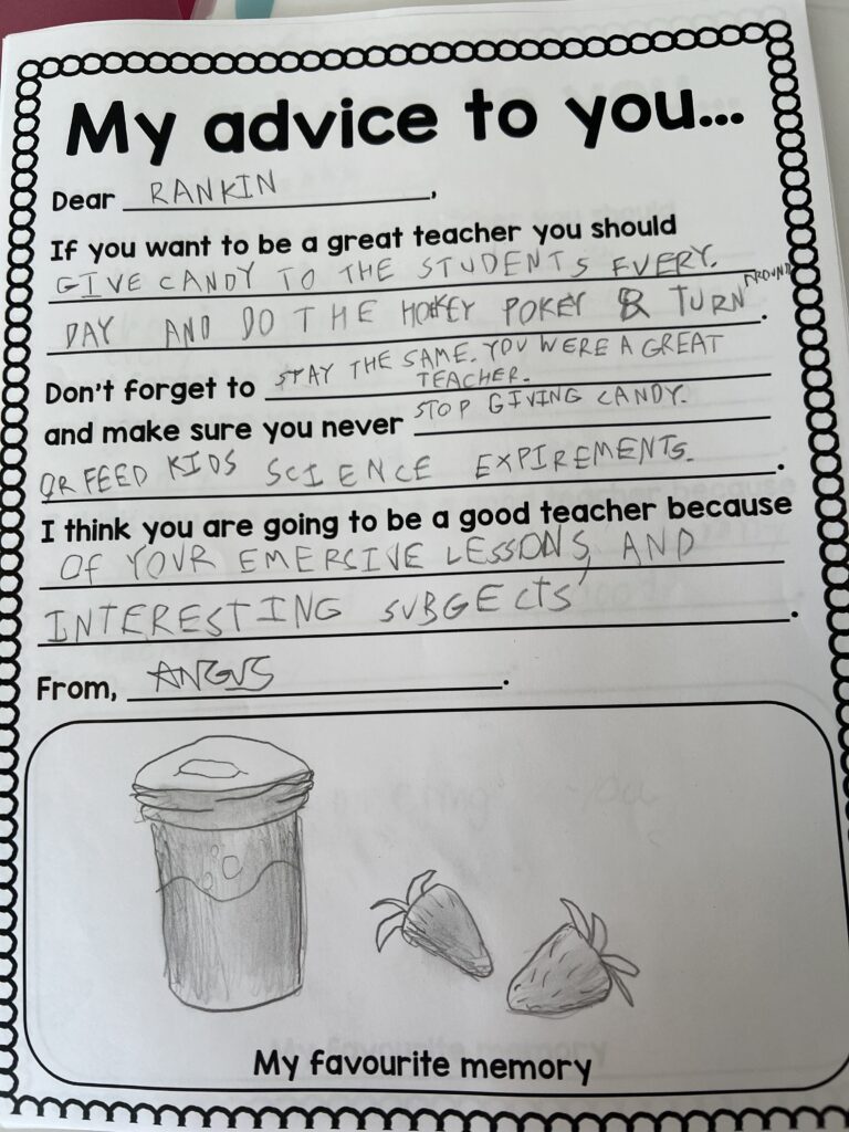 A couple of my favourite responses from my last day of practicum of “my advice to you” from students. The second student was a student who is on the autism spectrum and was often reserved and quiet so I was very pleased when he wrote about how much he enjoyed my lessons.