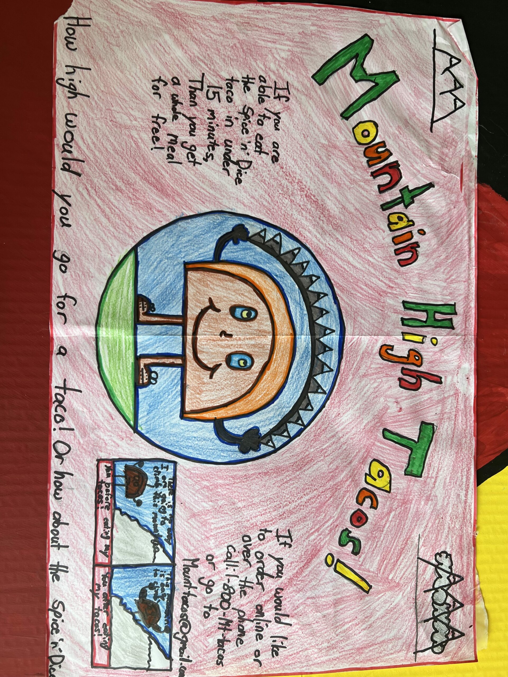 An example of one of my grade 6 business posters for their Taco Truck business. This project based learning was done for their math unit and students designed their own logos, business name, advertisement strategies, menus and more.